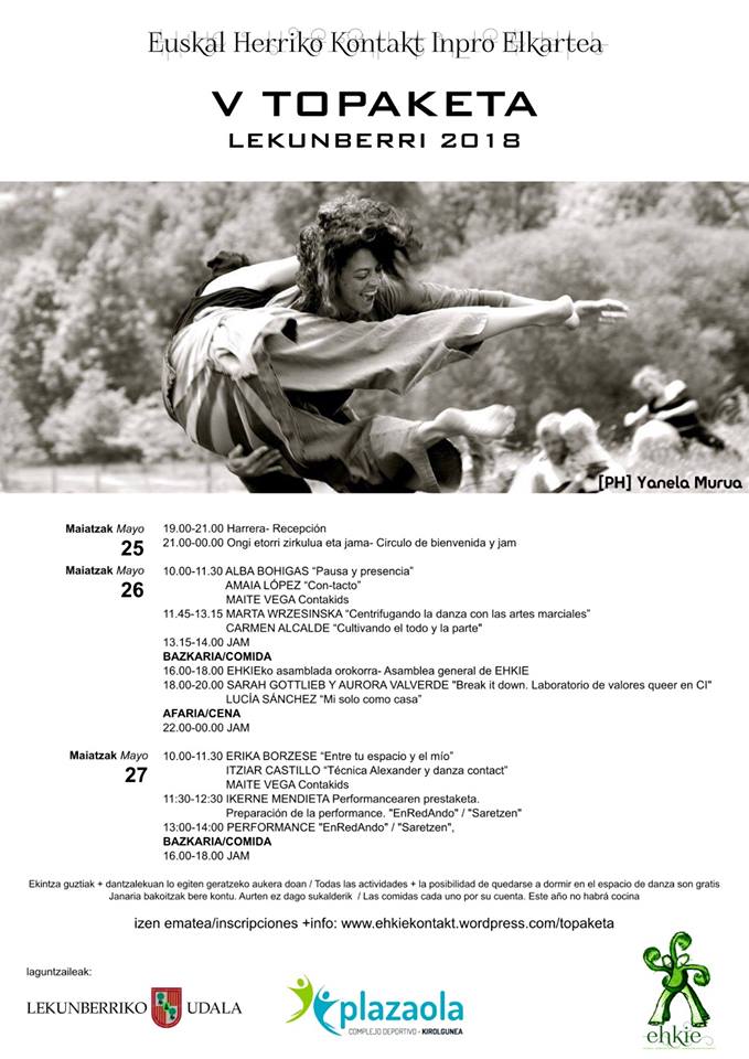 Topaketaren helburua Euskal Herriko kontakt inpro. dantzarien topaleku izatea da, komunidadea indartzea, gune ezberdinen artean zubiak sortzea, kontakt inpro.a kalean ezagutzera ematea eta guztion artean sortua den asteburu eder honetaz disfrutatzea.